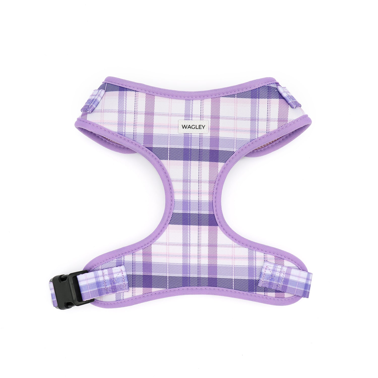 a modern twist on a timeless pattern. the gingham harness features a fresh purple check print with lightweight, breathable construction and fully adjustable straps. everyday style with just the right amount of charm.