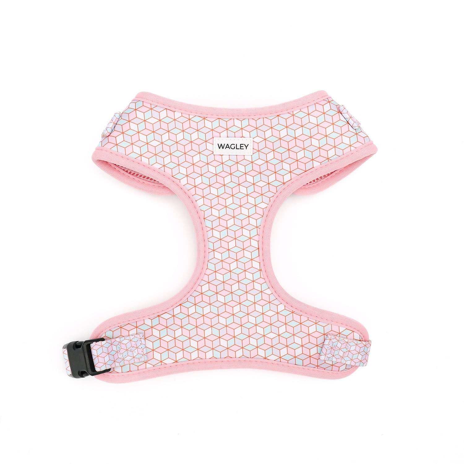 modern style, effortless fit. the prism harness features a bold geometric print in soft blush tones lightweight, breathable, and fully adjustable for all-day comfort. for pups who like their walks with a side of style.